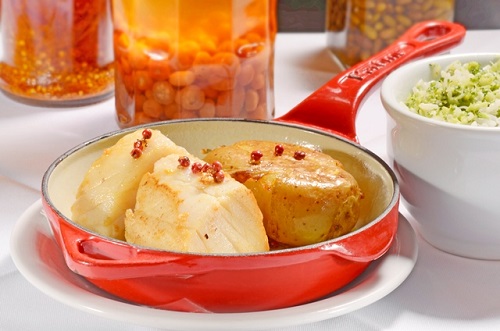 Bacalhau grelhado com Batata ao murro e Arroz com Brócolis