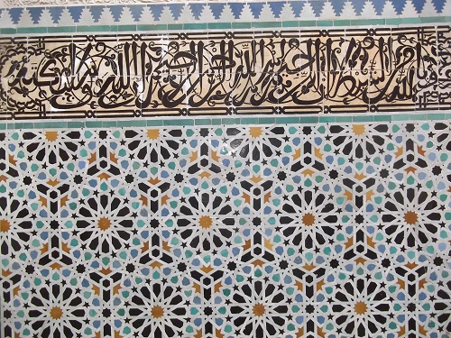 Detalhe dos mosaicos e da escrita árabe em uma Mesquita em Fes